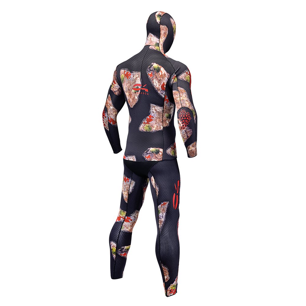 - The exclusive design of this wetsuit features a carbon fiber colored background with 3D camouflaged seabed stains.